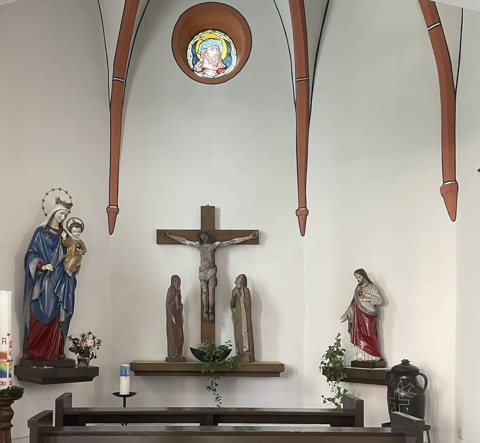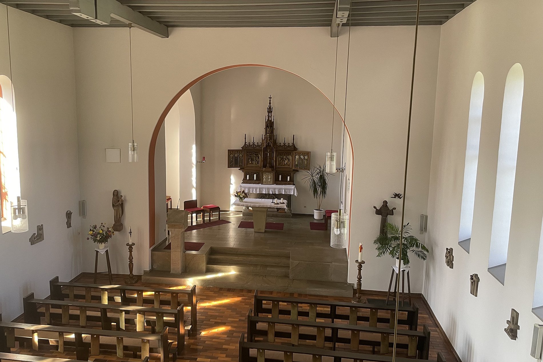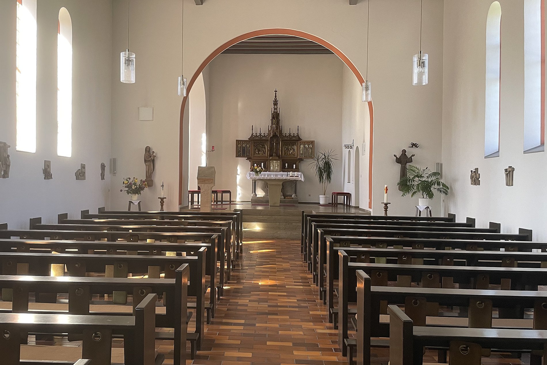 Besonderheiten: Marienfigur, eine Darstellung des heiligen Franz von Assisi, sowie Kreuzweg mit der 15.Station des Auferstandenen und eine Kreuzigungsgruppe von der Künstlerin Anneliese Degen aus Höhr-Grenzhausen.